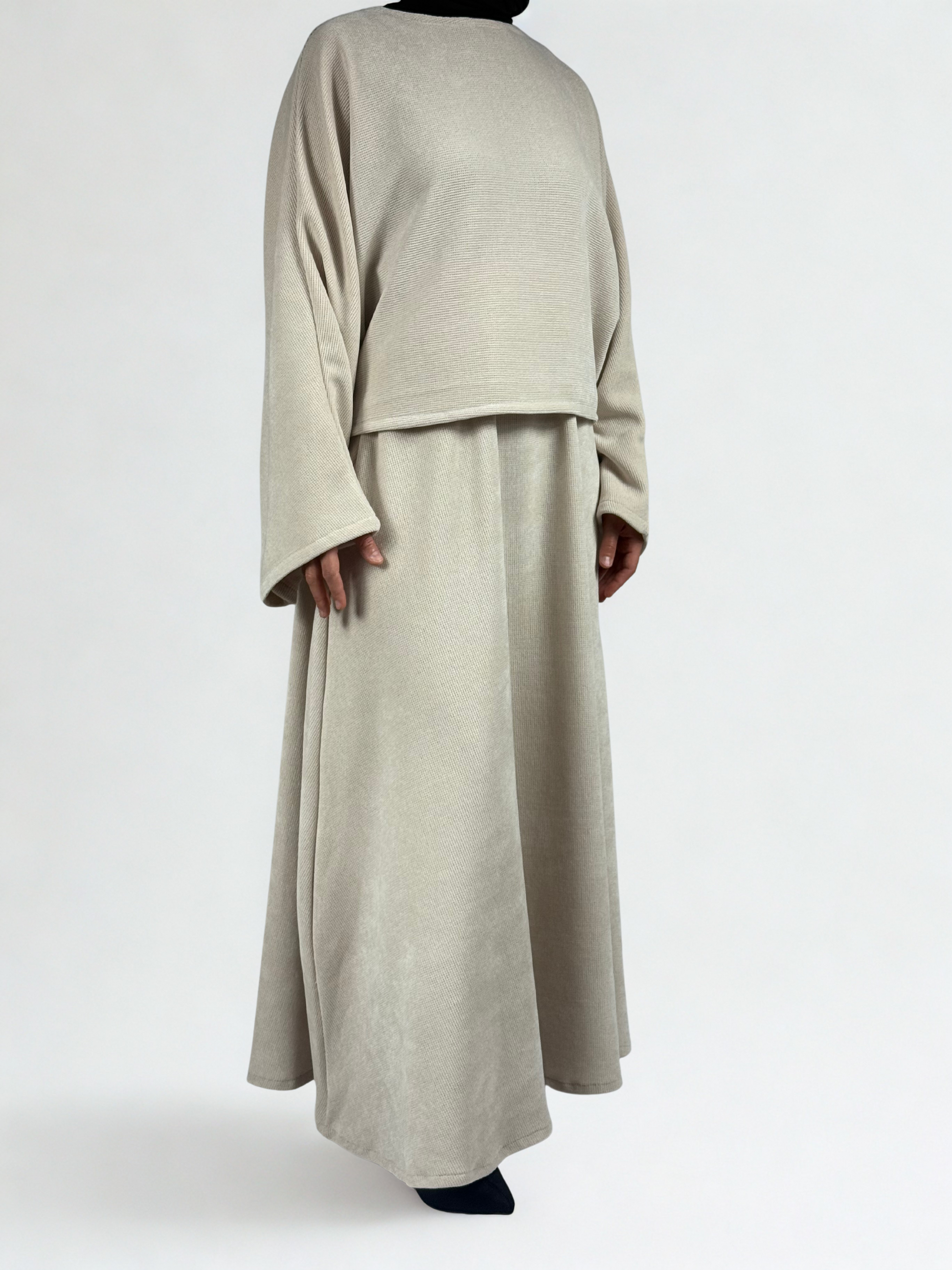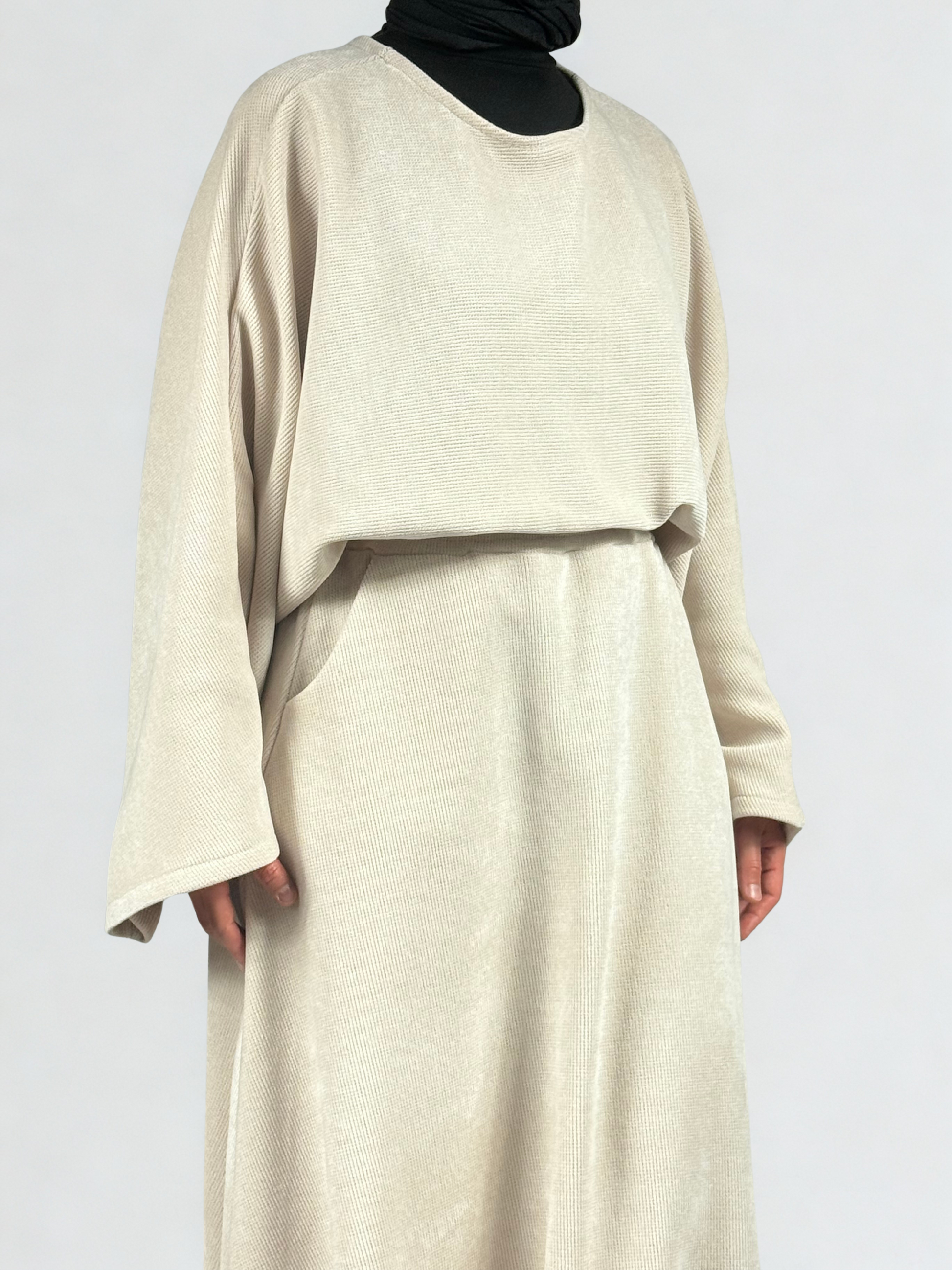 Dieses edle Zweiteiler-Set vereint minimalistisches Design mit fließender Silhouette und höchstem Tragekomfort. Das Oberteil besticht durch seinen lockeren, weich fallenden Schnitt mit weiten Ärmeln, während der lange Rock mit fließendem Fall eine elegante, feminine Linie zaubert.