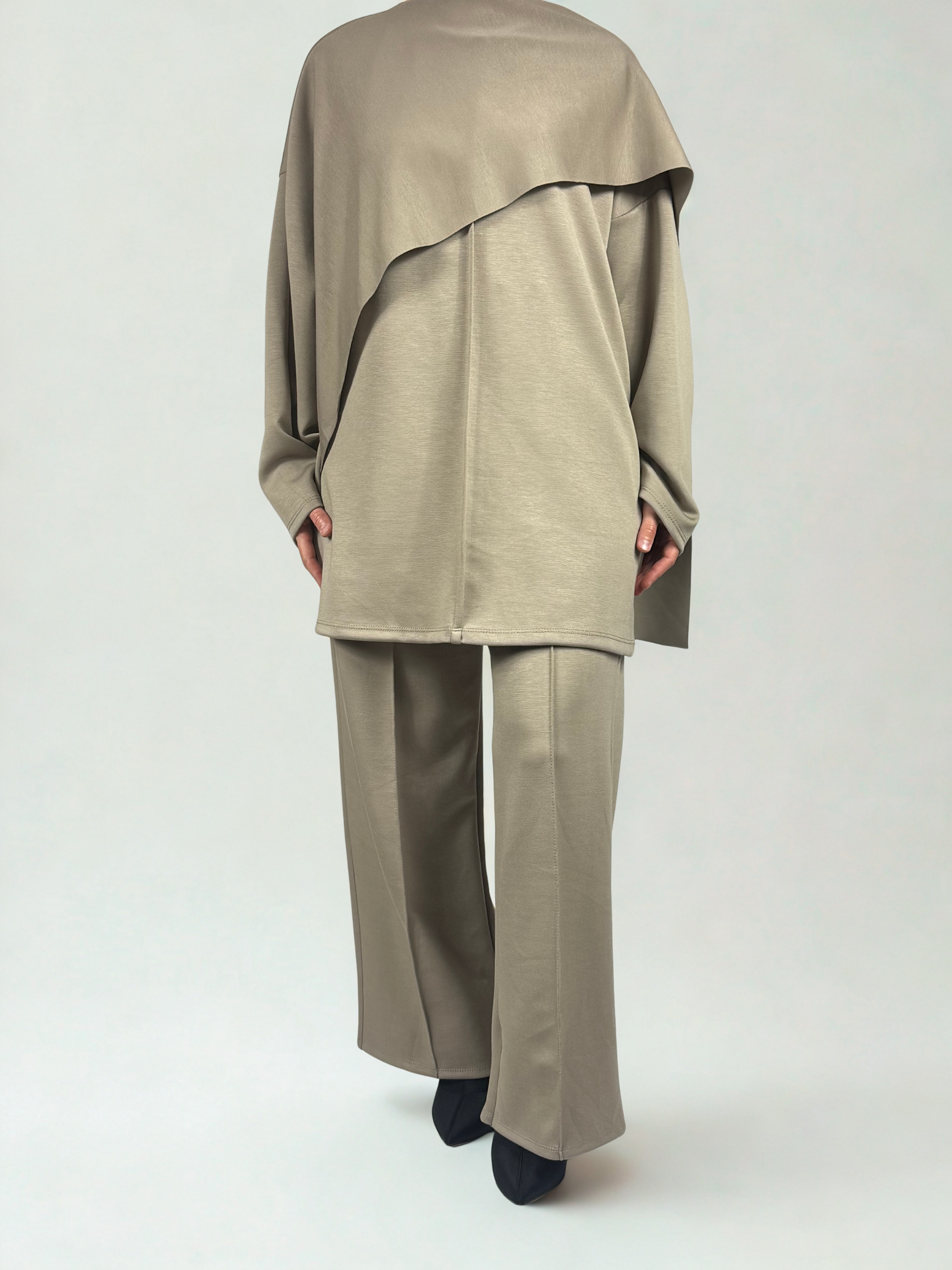 Eleganz trifft auf Komfort – dieser stilvolle Zweiteiler überzeugt durch sein fließendes Design und einen modernen, entspannten Schnitt. Das Oberteil verfügt über einen elegant integrierten Schal, der nahtlos in eine asymmetrische Rückenpartie übergeht und dem Look eine besondere Raffinesse verleiht. Die locker fallende Hose mit weitem Bein rundet das Ensemble harmonisch ab und sorgt für ein angenehmes Tragegefühl.