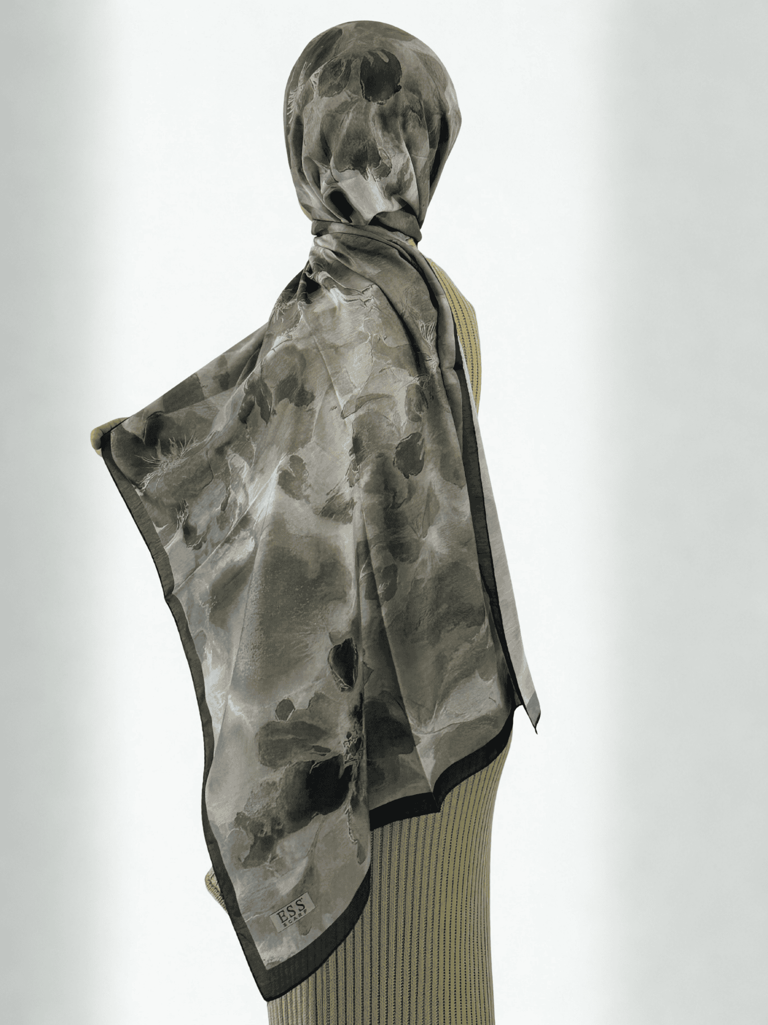 Das sanfte Blumenmuster in Oliv-, Grau- und Beigetönen verleiht dem Tuch eine ruhige, edle Ausstrahlung.