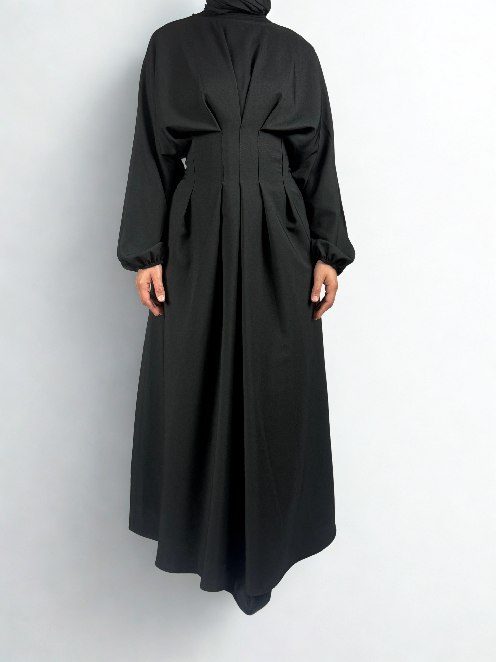 Der hohe Kragen und die langen Ärmel sorgen für einen dezenten, klassischen Auftritt, während die feinen Falten auf der Vorderseite und der Bindegürtel im Rücken die Taille wunderschön betonen. Durch das elastische Rückenteil passt sich das Kleid angenehm an die Figur an und bietet gleichzeitig hohen Tragekomfort.