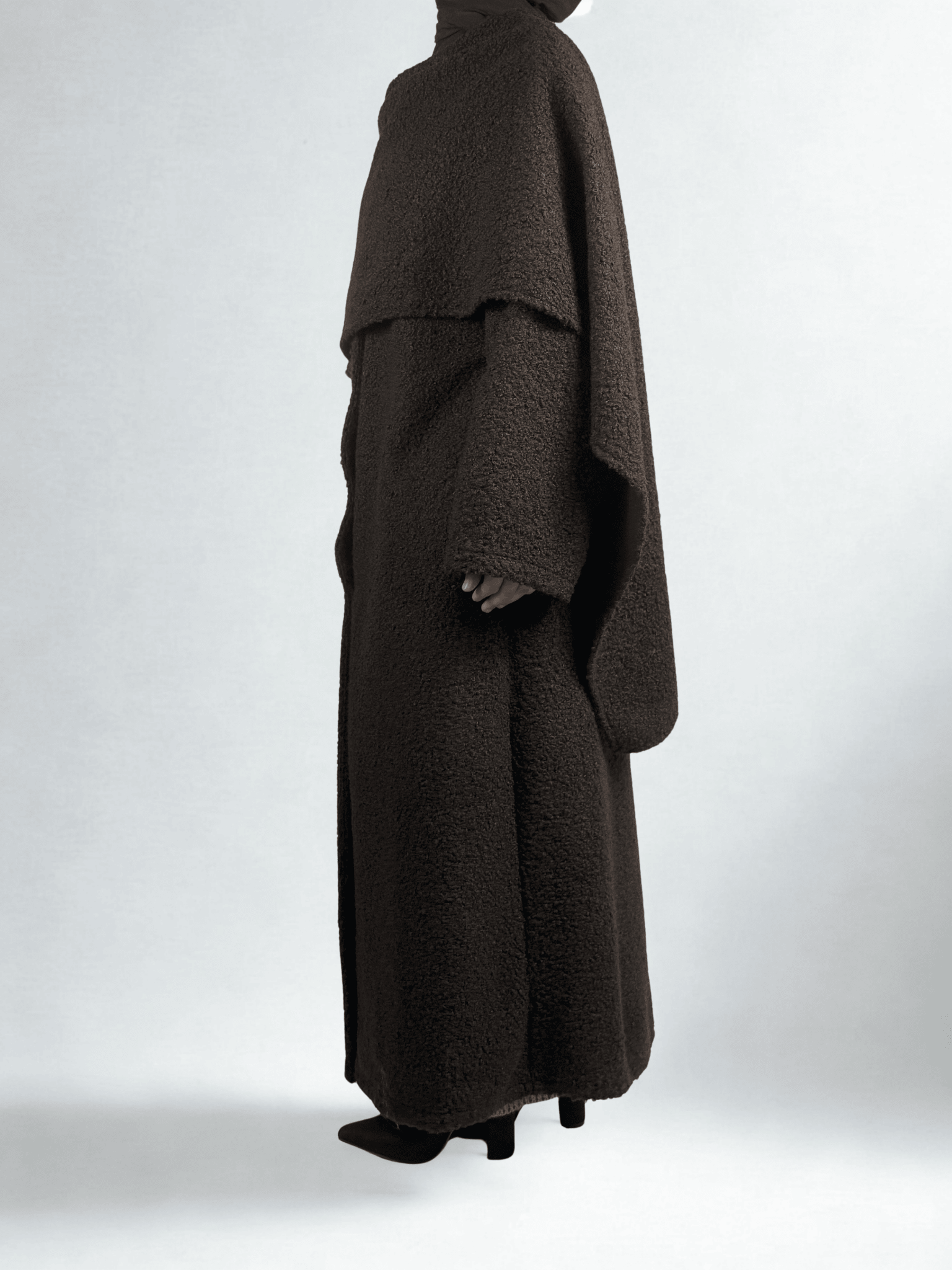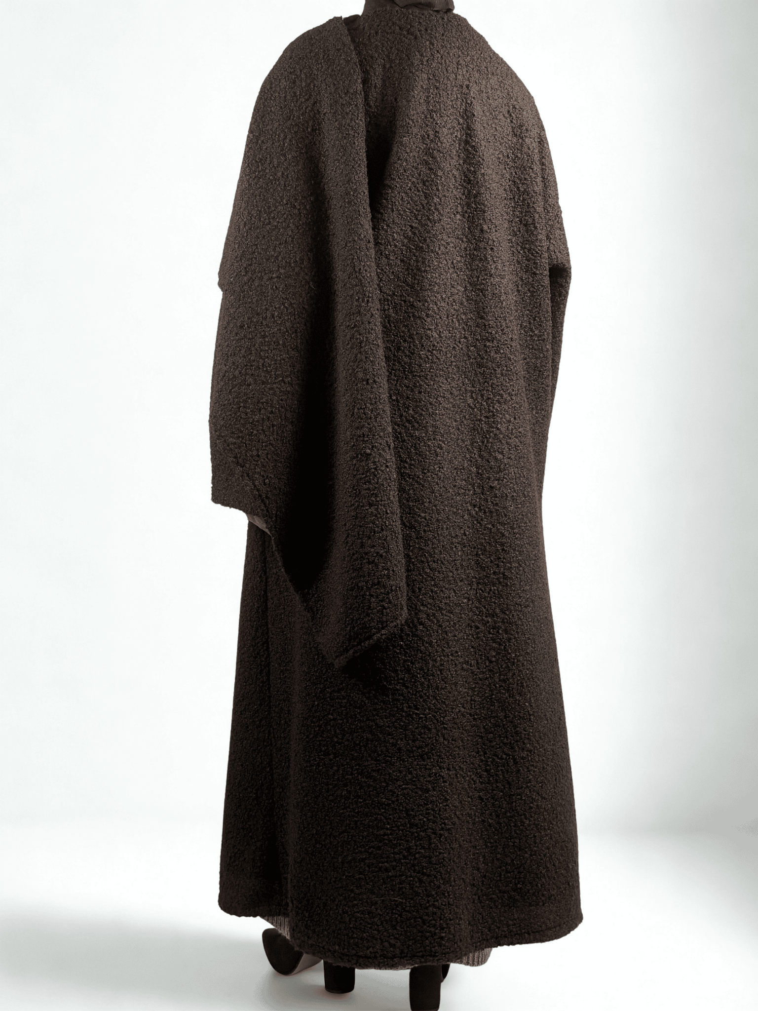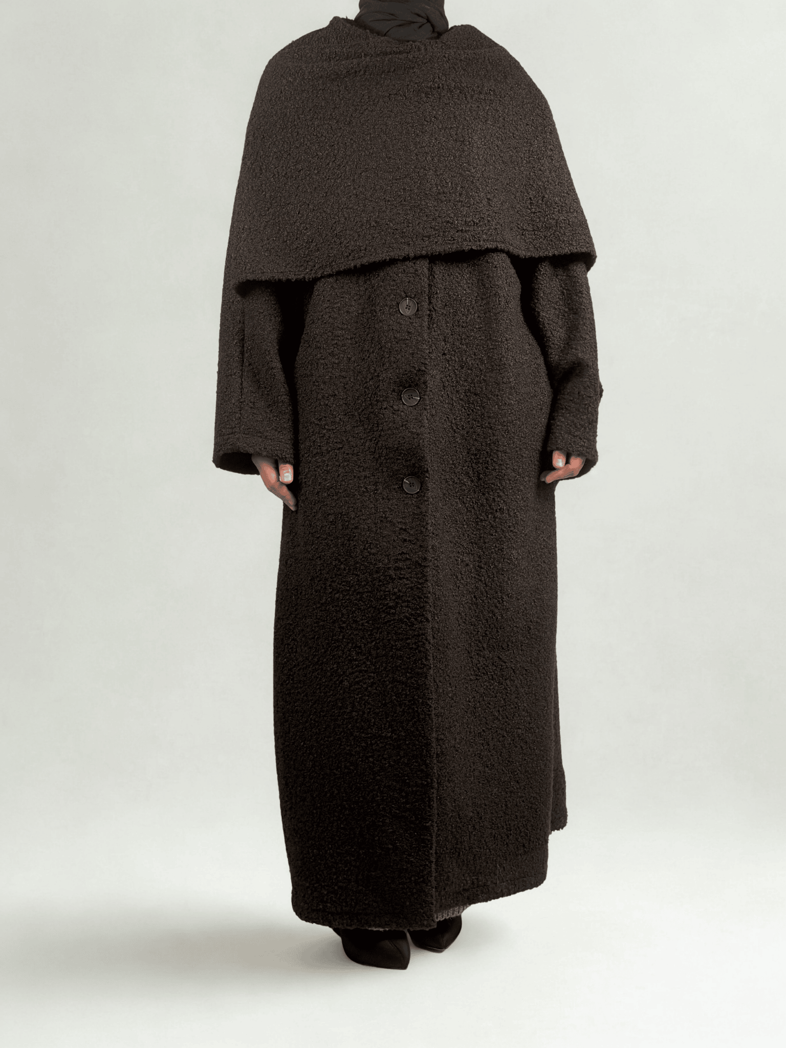 Dieser edle Bouclé-Mantel vereint modernen Chic mit praktischer Funktionalität. Das besondere Highlight ist der integrierte Schal, der sich weich um die Schultern legt und dem Mantel eine luxuriöse, fließende Silhouette verleiht.