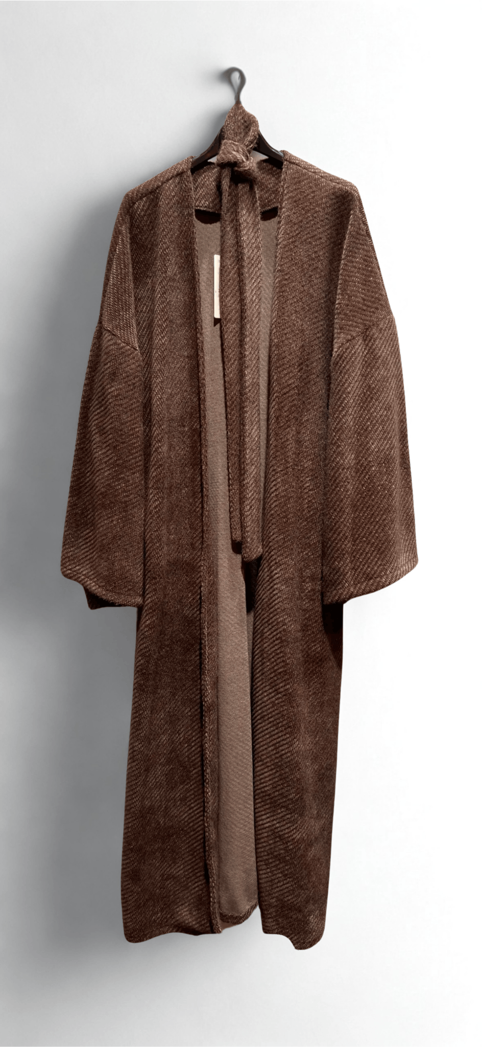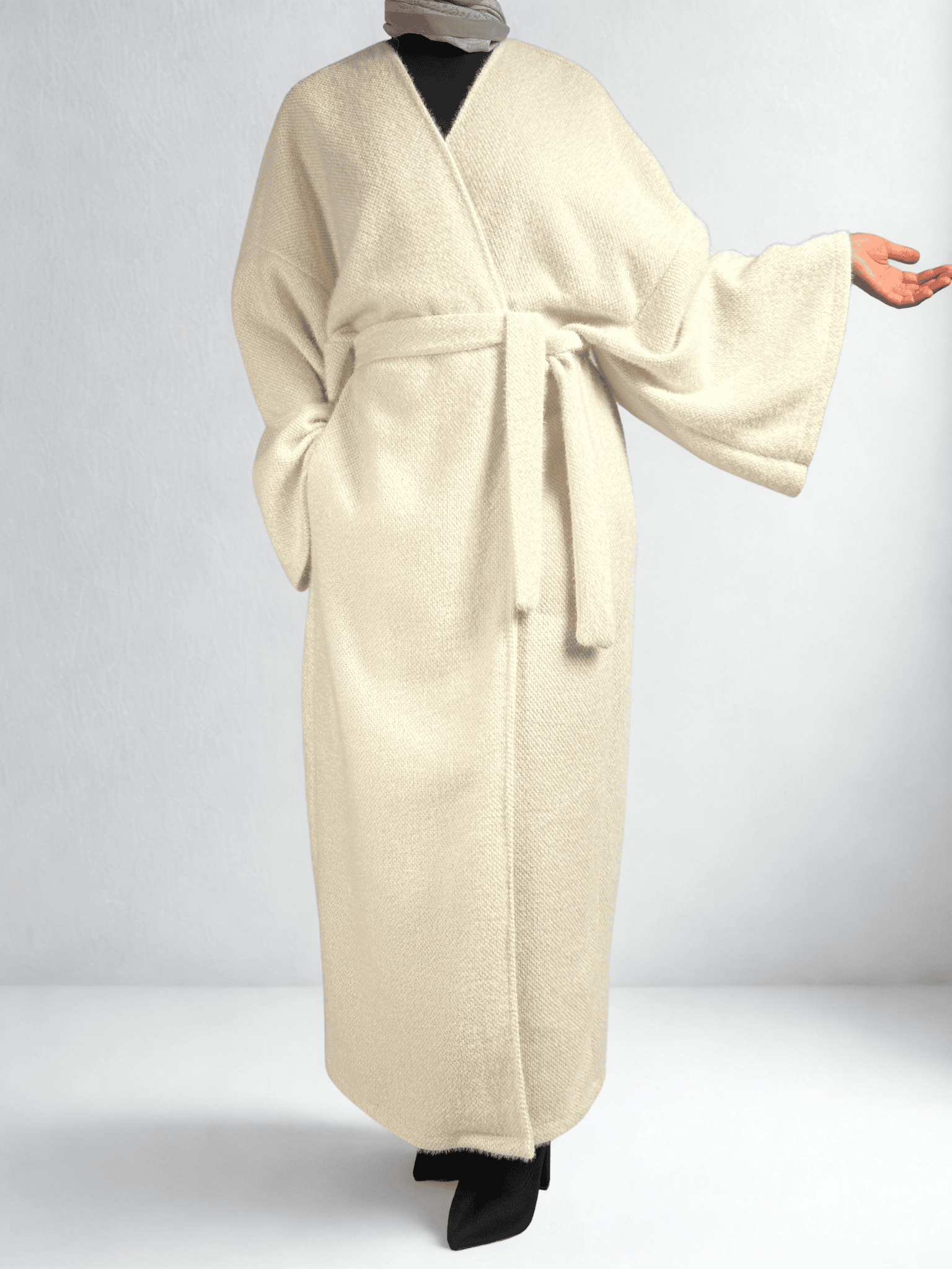 Mit dem passenden Bindegürtel lässt sich die Silhouette individuell betonen – locker getragen für einen lässigen Stil oder tailliert für eine elegante Passform. Die weiten Ärmel und die sanfte Struktur des Materials verleihen dem Mantel eine edle, zugleich gemütliche Ausstrahlung.